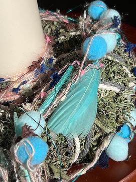 Ein handgeflochtener Kranz aus heimischen Flechten in zartem Hellblau-Türkis,